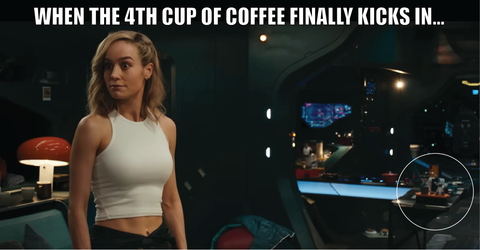 We have so many questions...Who would have thought Captain Marvel likes having coffee before putting on her suit?